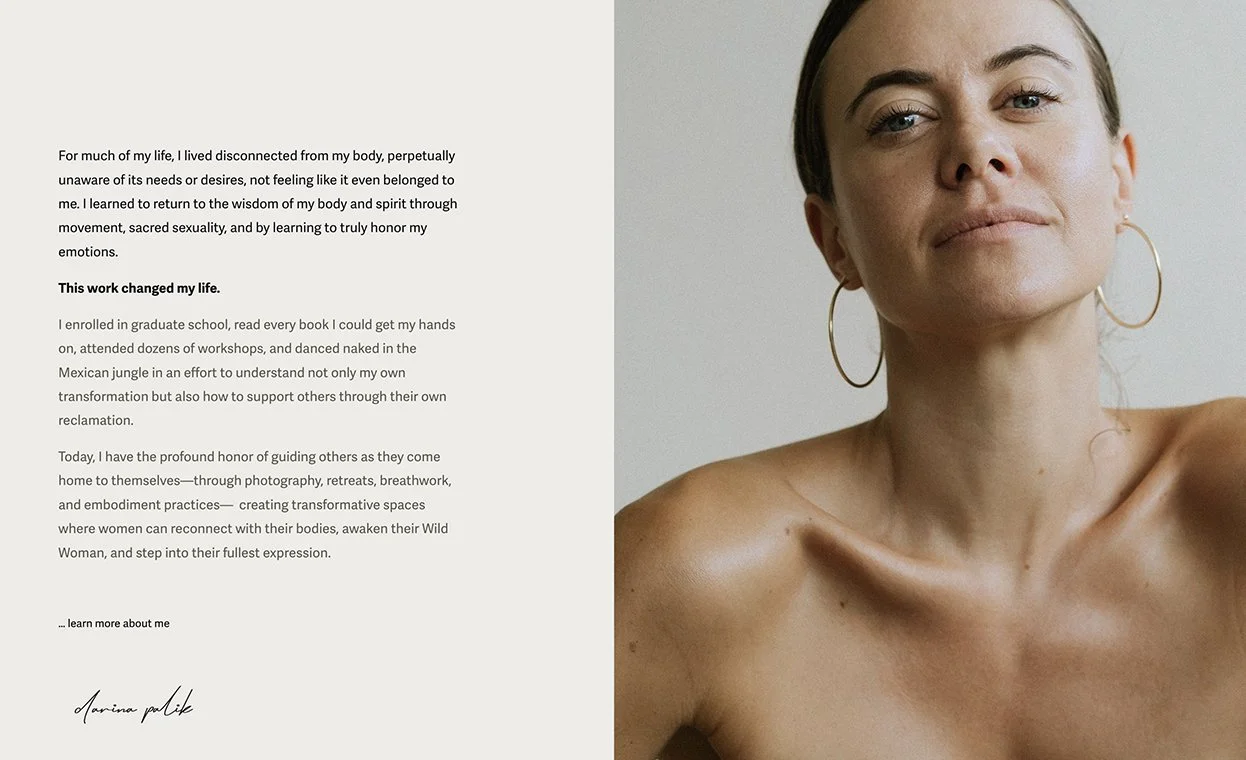 Davina Palik is a women’s empowerment coach, photographer, and retreat facilitator based in Costa Rica. This website serves as both a personal brand and platform for her multifaceted offerings—including 1:1 coaching, plant medicine retreats, and breathwork experiences. Built with intentional simplicity, the site highlights earthy tones and flowing typography to reflect Davina’s grounded, feminine energy. Each section is designed to evoke trust and emotional resonance, guiding visitors into a deeper connection with her work.
