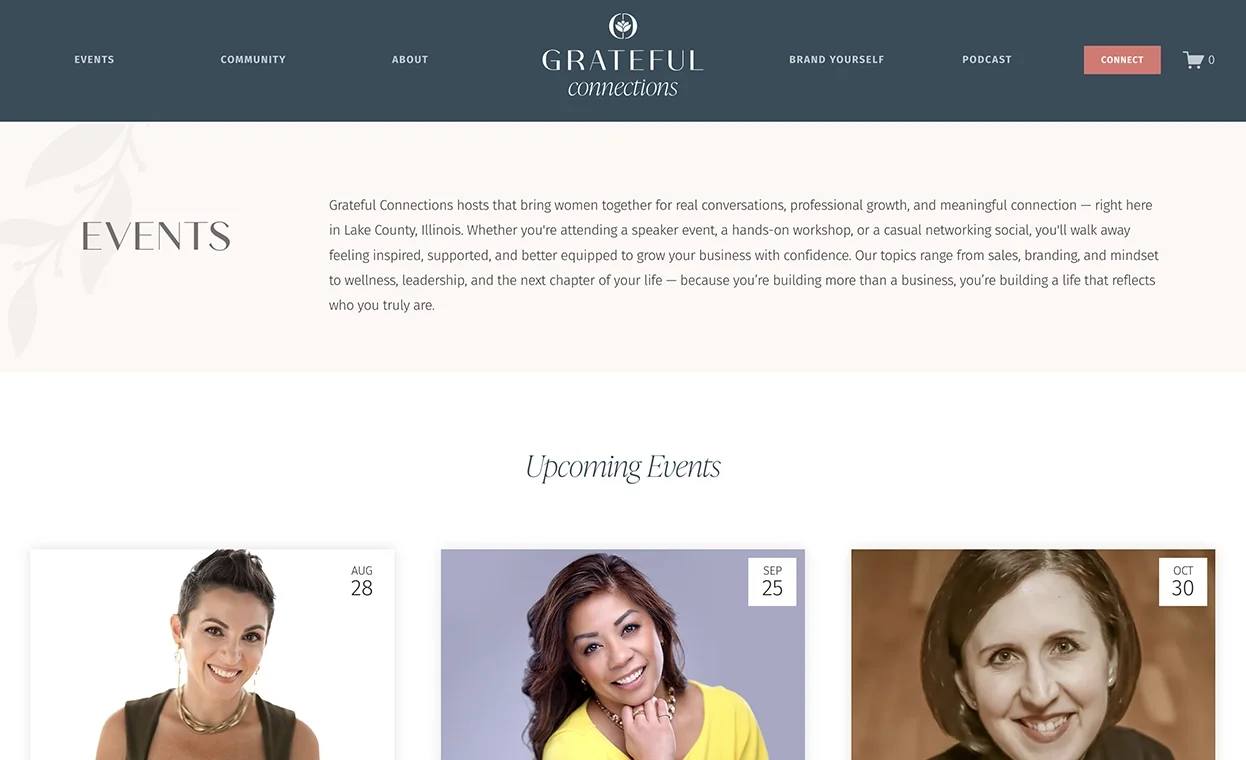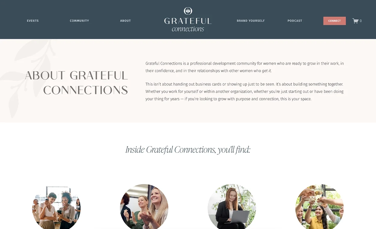 Grateful Connections is a community for women in business that offers networking, professional development, and opportunities for growth through real connection in a welcoming atmosphere.