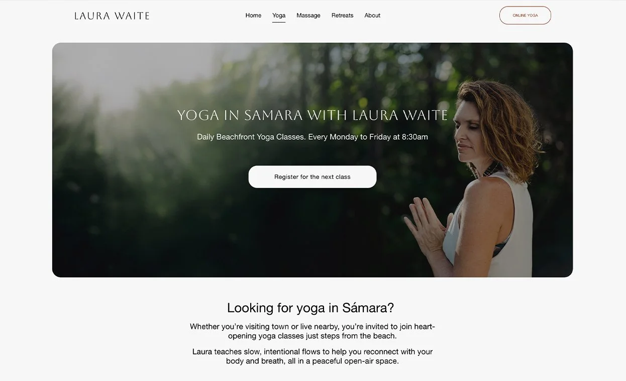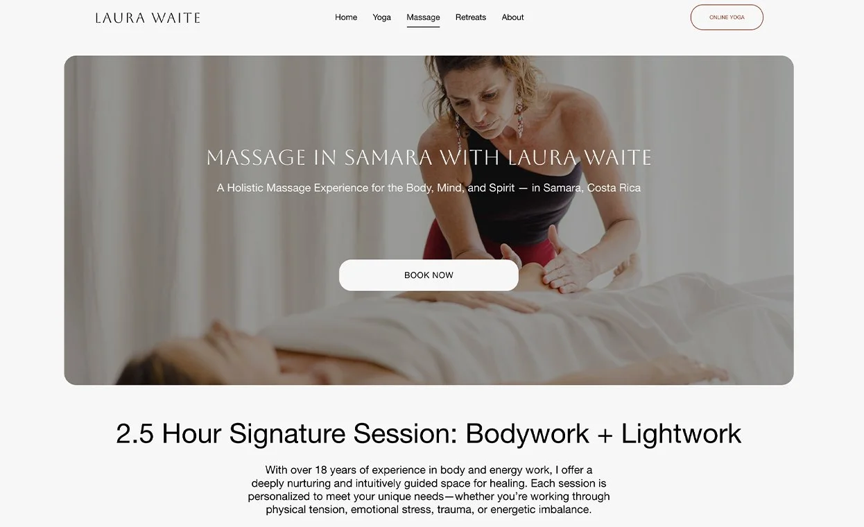 Laura Waite is a seasoned yoga teacher and breathwork guide based in Sámara, Costa Rica. Her website is a dynamic platform offering online classes, massage services, and retreat experiences, all presented through a serene and user-friendly design. Built to host a full content library and run a paid membership model, the site features a clean, intuitive layout supported by soft gradients and calming visuals.