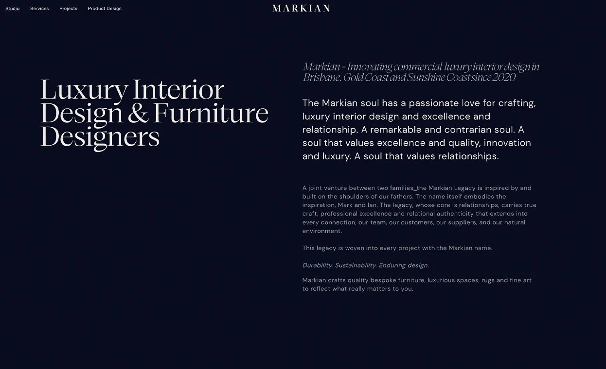 The Markian website reflects the studio’s philosophy: boldly contrarian, yet remarkably subtle. As a Brisbane-based interior design firm focused on commercial, hospitality, and luxury spaces, the site positions Markian as both creative collaborators and cultural storytellers. With architecture-inspired typography, immersive imagery, and curated case studies, the design is minimal yet expressive—mirroring their design ethos. Beyond visuals, the site offers a seamless user experience that ties together interiors, furniture, and form as one cohesive narrative, inviting visitors to engage with their refined, enduring approach to design.