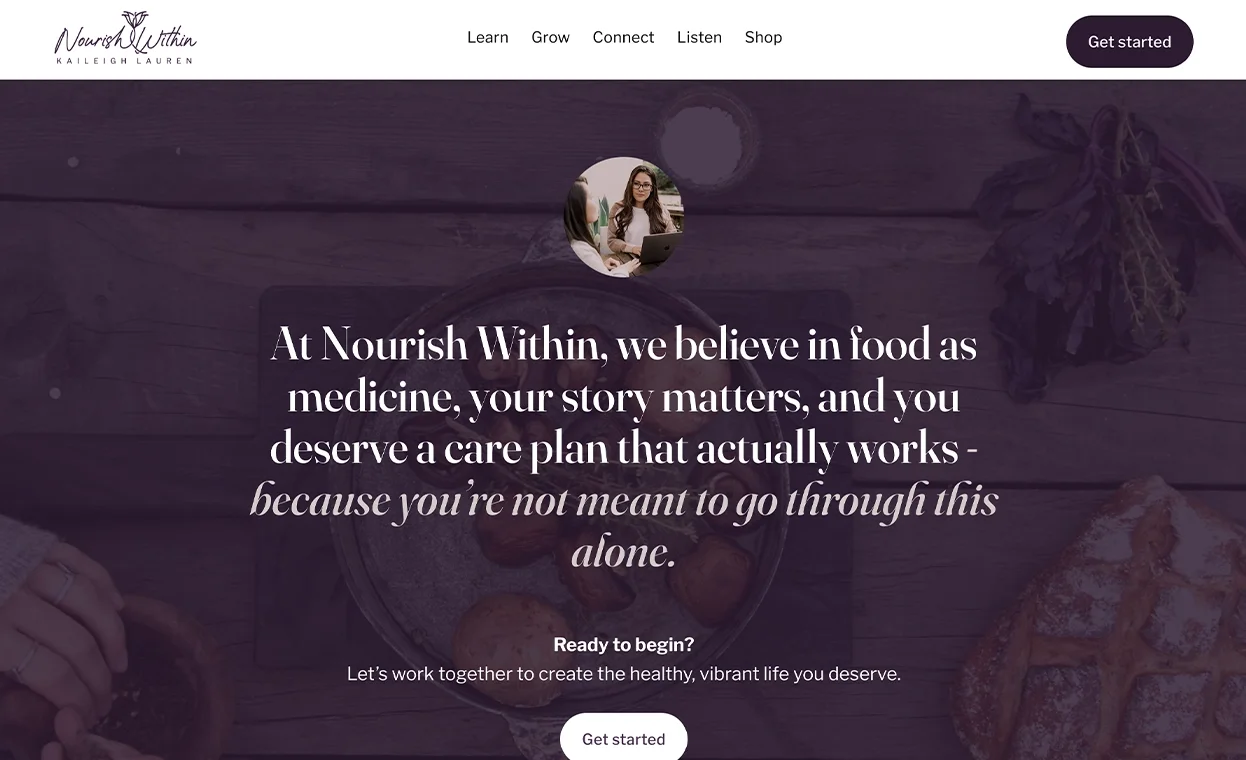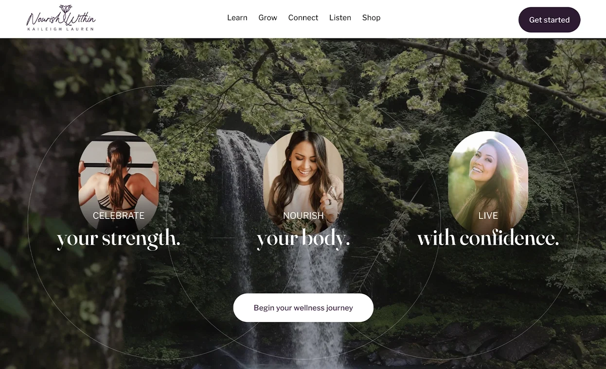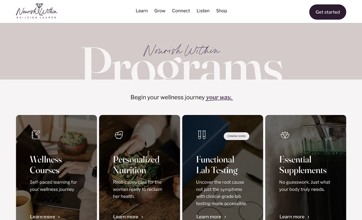 Visitors can enter through multiple pathways—self-paced wellness courses, personalized root-cause nutrition support, upcoming functional lab testing, and a curated resource ecosystem (freebie shelf, essential supplements, community referrals, and the Rebel Wellness podcast). The vision is simple: help women build capacity, confidence, and sustainable health that lasts. Nourish Within was designed to feel like a calm, confident exhale - equal parts editorial and inviting. The navigation intentionally mirrors the client journey (learn → grow → connect → listen → shop)