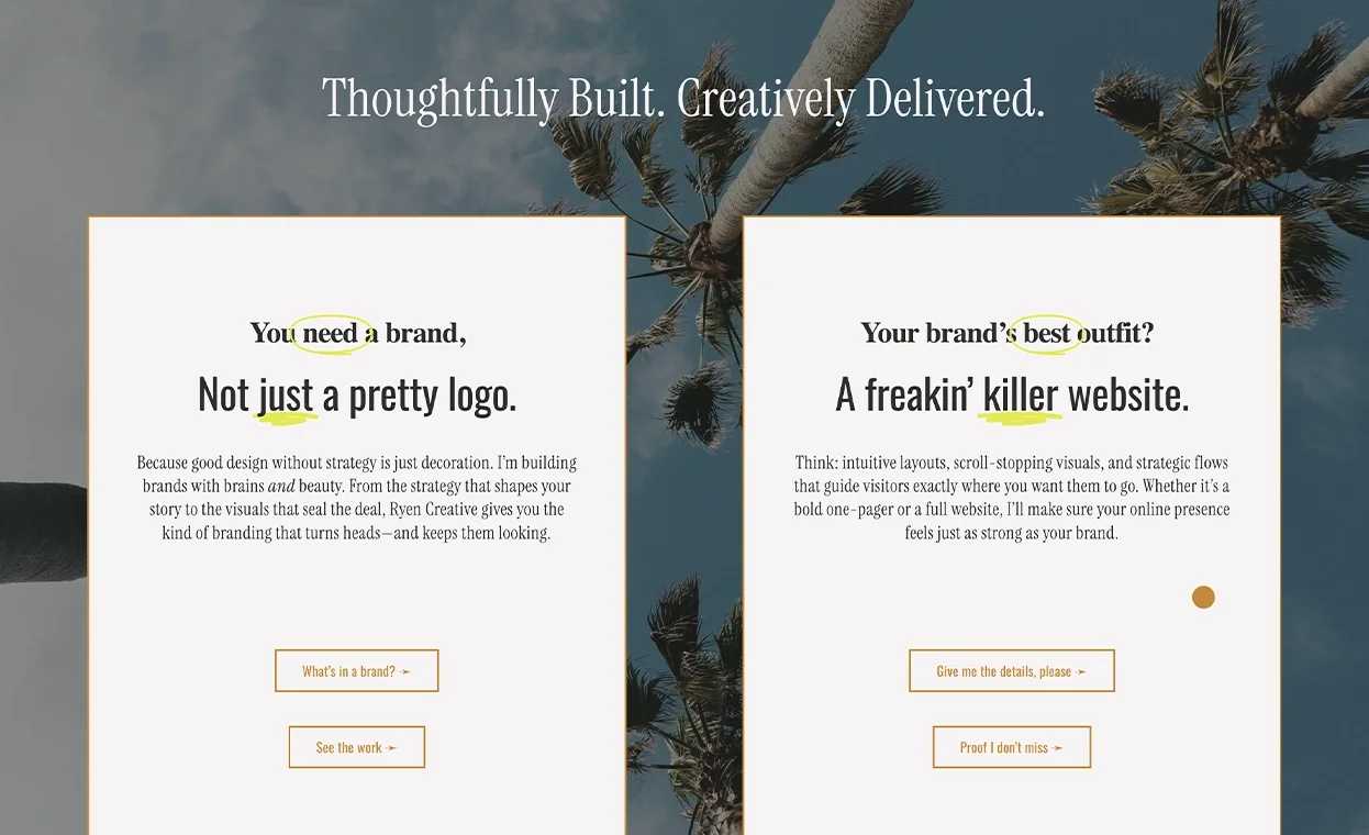 Ryen Creative’s website is a living embodiment of the studio’s philosophy: strategy-first design that’s as unapologetic as it is effective. Built on Squarespace, it’s intentionally minimal in structure but rich in purpose - every page leads with clarity, wit and a touch of irreverence that reflects the brand’s personality.