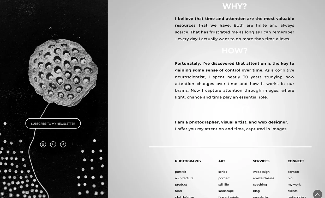 According to SquareKicker, who featured this website on its inspiration page and Instagram: “Stunning photography deserves a website that captivates from the first scroll! Sander Martens created this breathtaking photography portfolio that perfectly demonstrates how the SquareKicker Extension can transform your creative vision into reality. His striking black-and-white aesthetic showcases the power of scrolling effects, sticky blocks, anchor links, and scroll-up buttons to create an immersive user experience.” Inspired by the iPhone’s “dynamic island”, the navigation menu intuitively adapts its options based on each visitor’s choices, making the site both elegant and interactive.