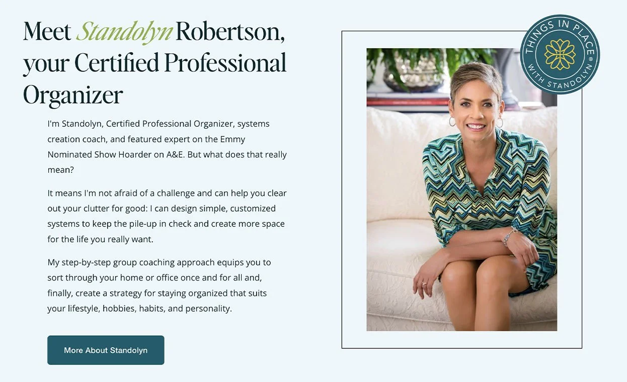 Standolyn Robertson, a professional organizer and former expert on A&E’s Hoarders, needed a fresh, modern website to promote her new group coaching program. I redesigned her site, updated her logo, and created a cohesive brand identity—using bright, hopeful colors and sunflower imagery to reflect her mission of bringing light and encouragement to her clients. The site includes custom graphics, soft textures, sticky animations for long text sections, and a thoughtfully designed long-form sales page. I also created a 15-page editable lead magnet in Canva, integrated with Squarespace email tools to support her list-building efforts. The result is a polished, purpose-driven site that fully represents her business.